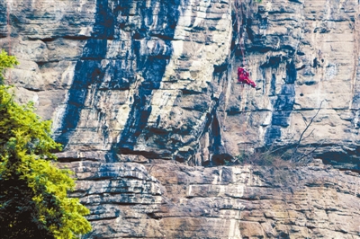 4月13日,四川省叙永县落卜村,东方物探新兴物探开发处2149队的王显压在悬崖上布线。为了找到适合开采的页岩气,他们每天要背着20多公斤重的电缆线在乌蒙山崎岖的山路上步行20多公里。