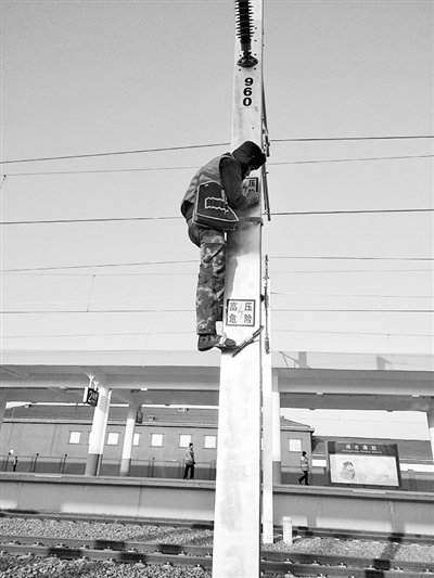 2018年12月20日,中铁武汉电气化局的接触网工在哈牡客专尚志南站安装支柱标志牌。王林 摄