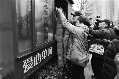据了解,“爱心单间”约4平方米,悬挂在街边。街道社区设有“爱心物品寄存屋”,储存市民捐赠的物品随时补充到“爱心单间”。根据需求,日后将适时在其他社区推广设立多个“爱心单间”。图为志愿者往“爱心单间”搬运悬挂捐赠衣物。