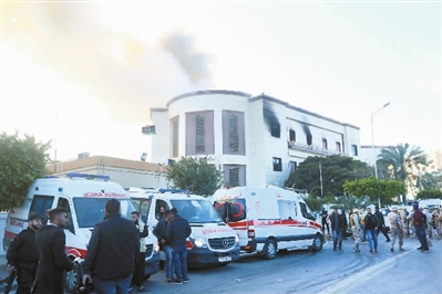 12月25日,在利比亚首都的黎波里,救护车停靠在袭击现场。当日,位于利比亚首都的黎波里的利民族团结政府外交部遭到袭击,造成至少两人死亡。     新华社发