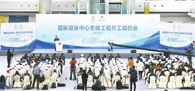 12月26日,国家游泳中心冬奥工程开工动员会在国家游泳中心“水立方”举行,“水立方”正式开始改造。改造后的国家游泳中心将在比赛大厅新增冰壶场地功能,满足北京2022年冬奥会和冬残奥会赛事需要;同时在南广场新增地下冰场,服务于群众冰上健身和普及冰壶运动。图为动员会现场(摄于12月26日)。 新华社记者 张晨霖 摄
