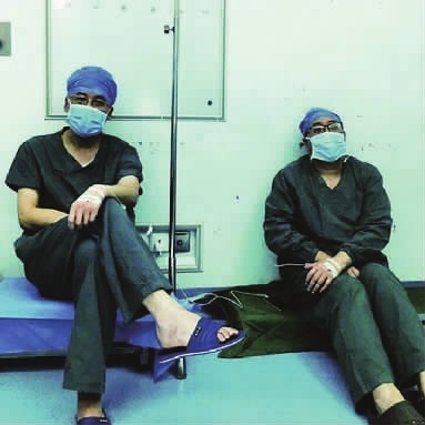 绿色的手术服还顾不上脱下,脚上还穿着手术拖鞋,两名医生在手术间隔的半小时,坐在手术室的脚踏凳上,共用一个吊针支架输液。药液一滴滴流下来,他们疲惫的脸上,却面带微笑。在这之前,他们为患者做了三台手术,站了10多个小时。