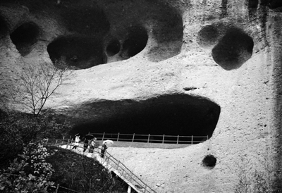 图为日前游客们在雨中游览大别山石窟。大别山石窟风景区位于安徽省六安市金安区张店镇南部山区,是皖西第一岩洞敞岩,距今已有1.6亿年的历史。大大小小的石窟难以数计,最大的可容纳数千人。近些年来,当地加大乡村旅游扶贫资金支持力度,给贫困村资金和政策倾斜。大别山石窟等景区基础设施建设得到很大改善,越来越受到游客们的欢迎。本报记者 吴凡 摄