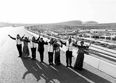 1月1日,在北京大兴国际机场航站楼前,新人们合影留念。