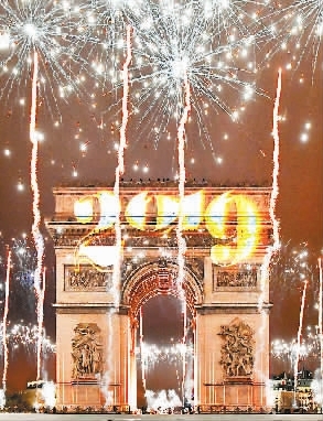 这是1月1日在法国巴黎凯旋门拍摄的灯光秀和烟火。新华社记者 陈益宸 摄