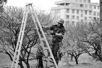 2018年12月26日,浙江金华,在市区梅园里,20多名园林工人正在给数万棵梅树整形修枝,将树冠上泛青的枝条修剪掉,待下一次梅花盛开时更繁茂,树形更美观。时补法 摄/视觉中国