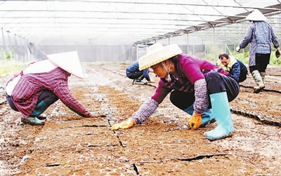 在钦州市钦北区那蒙镇竹山村,农民铺设竹苗育床(1月6日摄)。