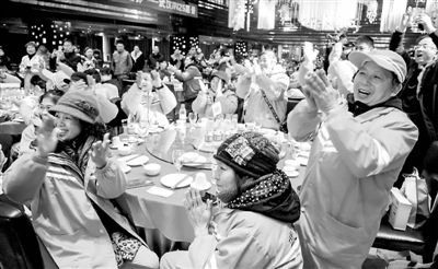 1月6日,活动现场一片温馨愉悦的氛围。当日,150名爱心人士为武汉市100名生活困难的环卫工人“圆梦”,为他们送去冰箱、电视以及体检等“暖心礼物”。活动举办方还带来了舞蹈、合唱等表演,环卫工人们发出欢声笑语,不时鼓掌。 张畅 摄/中新社