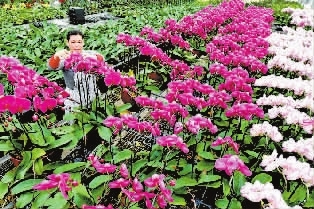1月9日,河北省怀来县一家花卉种植基地的工作人员管护即将上市的蝴蝶兰。