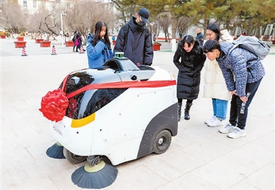 1月9日,无人驾驶清扫车“蜗小白”在内蒙古师范大学校园内进行清扫作业。