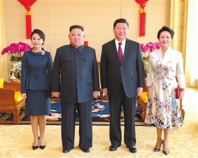 习近平和夫人彭丽媛同金正恩和夫人李雪主合影。