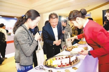 1月10日,北京航空食品有限公司改革开放成果通报会在京举行,图为该公司工作人员为现场观众介绍航空食品。