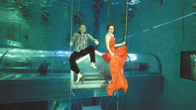 日前,艺术家玛丽娜·卡赞科娃和潜水员德米特里·马拉申科在位于意大利帕多瓦市的世界最深游泳池,献上了一场破吉尼斯世界纪录的表演。两人在不带氧气状态下,于泳池中共舞了3分28秒。为了使表演更具精彩性,他们站在水下的一根绳子上进行了表演。观众通过穿透水池中间的一个玻璃通道见证了他们的表演。 (东方IC)
