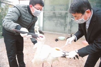 1月14日,沧州野生动物救护中心的工作人员在救治国家一级保护动物东方白鹳。
