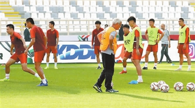 当日,中国国家男子足球队在阿联酋阿布扎比进行场地适应训练,备战16日与韩国队进行的2019年亚洲杯足球赛C组比赛。          新华社记者 李钢 摄
