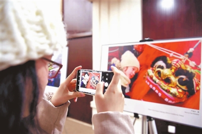 1月16日,记者在发布会上拍摄“欢乐春节”图片展。