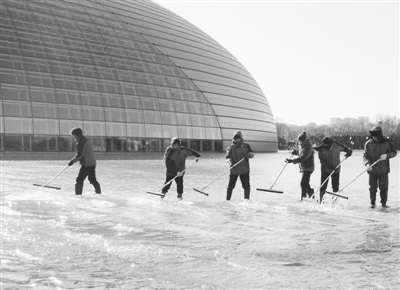 1月15日,北京遭遇大风天气,工人在寒风中清洗国家大剧院景观池,以靓丽的景致迎接新春佳节到来。