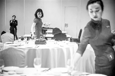 1月16日,天津和平区首届旅游饭店服务技能大赛在唐拉雅秀酒店举行,参赛选手在前厅接待、中式摆台、西式摆台、客房服务4个项目中争相献技。图为选手在进行中式摆台。佟郁 摄/中新社