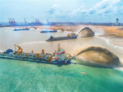 2018年6月20日,在斯里兰卡科伦坡,港口城项目工地上来自中国的四条大型耙吸挖泥船同时在吹沙。