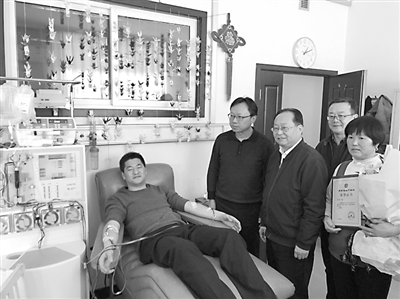 中华骨髓库实现2019年首例涉外造血干细胞捐献,中国红十字会副会长兼秘书长王平、安徽省红十字会秘书长曹芦松专程前往采集医院慰问,为李茂颁发捐献造血干细胞荣誉证书,并献上鲜花。刘姝 摄