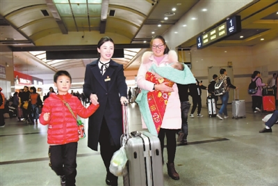 为让农民工平安返乡,该站出台了相关措施,组织党员志愿者为旅客提供引导问询、帮扶等暖心服务。图为志愿者黄烨琳为带两孩子出行的旅客提供帮助。