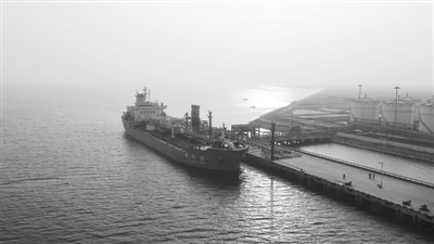 图为1月10日,在河北曹妃甸液化码头,冀东油田新年首船外销原油正在装船。