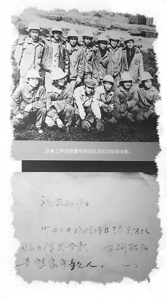 这是一张老照片,是13个小伙子在沙参二井旁的合影。照片背面,是他们写下的“生死状”:沙参二井抢险保井青年突击队临上阵前合影,准备殉职后告慰家中亲人。