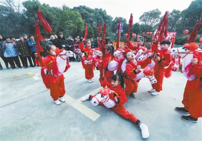 1月16日,孩子们为新塘村村民表演传统非遗项目——下箬马灯。下箬马灯是发源于长兴县的民间舞蹈,距今已有1000多年历史。临近春节,浙江省长兴县开发区中心幼儿园的老师和孩子们来到长兴县太湖街道下属的新塘村,为村民表演文艺节目,用喜庆的传统舞蹈营造节日气氛。另外孩子们还用纸盒、瓶子、彩色包装纸等废旧物品制作了环保花灯,送给村民,倡导低碳环保的节日新风。