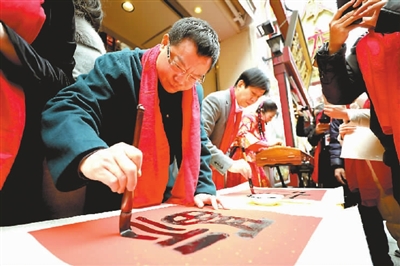 1月20日正值二十四节气中最后一个节气大寒。当天,近百名中国书法家来到以美食著称的日本横滨中华街,在红纸上挥毫泼墨书写春联和“福”字,提前将中国春节的喜庆气氛传递给当地民众。