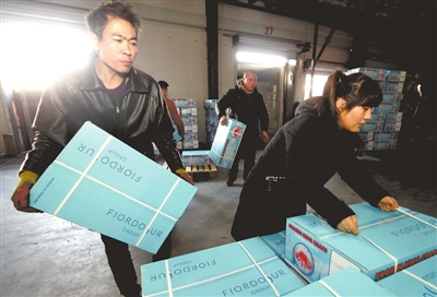 1月20日,铁路上海货运中心的工作人员将冷冻的春节年货打包后存储。