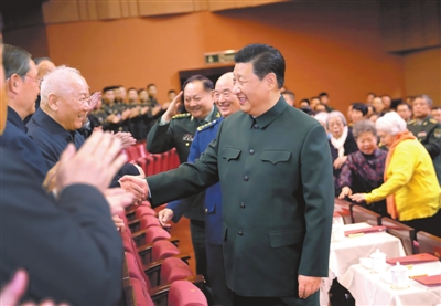 下午3时30分许,习近平来到老同志中间,全场响起热烈掌声。习近平同大家亲切握手,关切询问他们的身体和生活情况,共同回顾在党的十九大精神指引下,过去一年来党、国家和军队事业展现的新气象、开创的新局面、取得的新成就。老同志们一致表示要更加紧密地团结在以习近平同志为核心的党中央周围,坚持以习近平新时代中国特色社会主义思想为指导,深入贯彻习近平强军思想,深入贯彻新时代军事战略方针,锐意进取,埋头苦干,以优异成绩迎接新中国成立70周年。