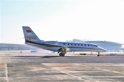 1月22日10时10分,一架“奖状680”校验飞机平稳降落在北京大兴国际机场西一跑道上,留下了第一道飞机轮胎印迹,意味着北京新机场第一场校验任务圆满完成,机场工程建设即将进入验收移交阶段。 新华社发(汪洋 摄)