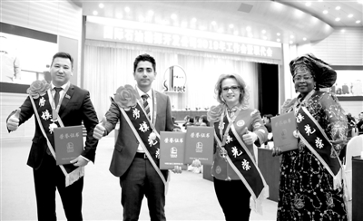 1月22日,北京,中国石化国际石油勘探开发公司年度工作会上4名“洋劳模”合影。