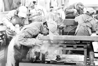 1月17日,在惠安县崇武镇的一家石材出口企业,工人在打磨花岗岩墓碑石。