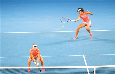 1月23日,在2019澳大利亚网球公开赛女双半决赛中,张帅(中国)/斯托瑟(澳大利亚)以2比1击败捷克组合斯特里科娃/冯德劳绍娃,晋级决赛。图为张帅(右)/斯托瑟在比赛中。