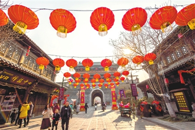 1月24日,游人在山东省潍坊市青州古城景区赏灯游玩。春节临近,各地张灯结彩,营造出浓浓的节日气氛。