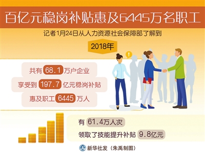 为了更好地发挥政策效应,2018年,人社部门优化经办服务,简化申请程序。全年共有68.1万户企业享受到了197.7亿元的稳岗补贴,惠及职工6445万人,有61.4万人次领取了技能提升补贴9.8亿元。