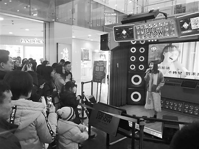 1月24日,在北京西直门附件的一家购物商场内,“迷你秀”舞台上,一名女孩的演唱吸引了不少人驻足围观。