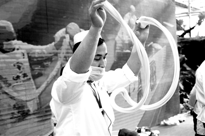 1月29日,选手展示拉面技艺。当日,中国拉面精英争霸赛在青海省化隆回族自治县开赛,来自全国的68个团队的150余位选手参加比赛。比赛现场,选手分别展示了毛细、二细、宽面等拉面制作技艺,赢得观众阵阵喝彩。