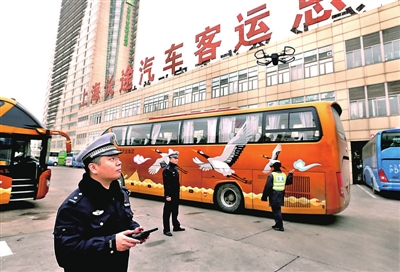 1月30日,民警倪佳在上海长途汽车客运总站操作无人机对客运大巴车站外上下客进行巡查。
