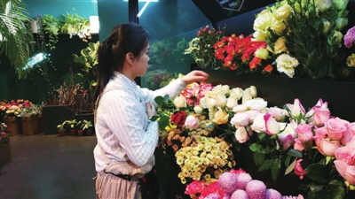 “多头红玫瑰1支,香槟玫瑰1支……”对照着手机上刚接到的订单,李盼在花柜前挑挑拣拣,不一会儿就拿齐了订单上的鲜花。正巧有顾客推门而入,她又赶紧放下手中待包装的花束,笑着迎上前,“您想要选些什么花?”