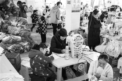 1月19日,河南省镇平县贾宋镇的一个服装车间内,周书萍正在赶工,她9岁的女儿坐在缝纫机旁写寒假作业。