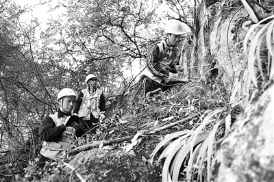 为确保春运期间列车运行安全,近期,汉中工务段组织职工对管内山体隐患进行排查。图为乐素河桥隧车间职工正在对王家沱至乐素河区间重点危石病害进行测量。