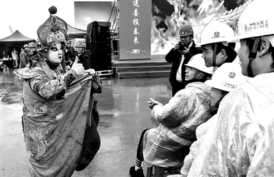 1月30日,川剧“变脸”表演者与建筑工人进行互动。当日,陕西省总工会春节慰问演出走进中建八局西安丝路国际会展中心项目施工现场,与600多名工人代表一同联欢,送上新春祝福和慰问。
