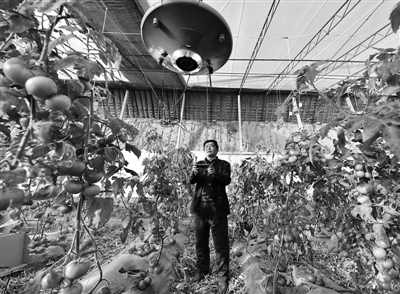 图为阳高县大白登镇小白登村农业合作社负责人张利在大棚里用手机操作植保机。