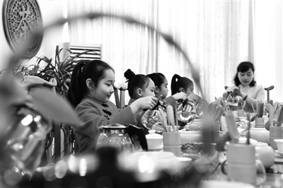 1月30日,学生们在乐亭县青少年校外活动中心学习茶艺。