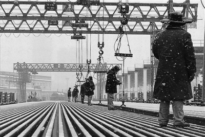 春运正酣,火车载着人们踏上回家的路。近年来,不仅高铁网越来越发达,普速铁路升级换代的步伐也大幅加快,而让旅行更加平稳舒适的背后离不开长轨装备技术的日益普及。 图为1月25日,中国铁路哈尔滨局集团有限公司工务大修段的职工正迎着风雪在长轨生产线上吊运钢轨。