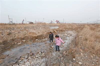 小站前干枯的河床成了孩子们的游乐场。