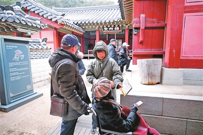2月6日,在韩国水原市,几名中国游客在水原华城行宫内研究导览图。