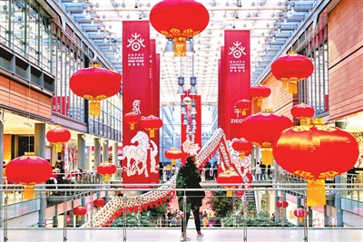 1月24日,在德国柏林的波茨坦广场购物中心内,一名行人经过购物中心内的中国春节特色装饰。